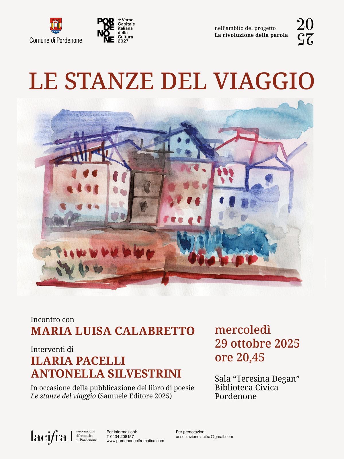 Incontro con Maria Luisa Calabretto mercoledì 29 ottobre 2025, ore 20,45sala Degan, Biblioteca Civica di PordenoneL’Associazione “la cifra” organizza un incontro con Maria Luisa Calabretto per la presentazione del suo libro di poesia “Le stanze del viaggio” (Samuele Editore 2025) nella sala Degan della Biblioteca Civica di Pordenoneil 29 ottobre 2025 alle ore 20,45.All’incontro interverranno…